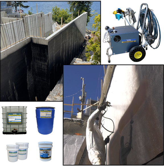 SUPERSEAL Waterproofing is a water-based rubberized coating. It's available in a 2 component, instant-set system that is applied with a pump or in roller grade pails (Not instant-set) also available
